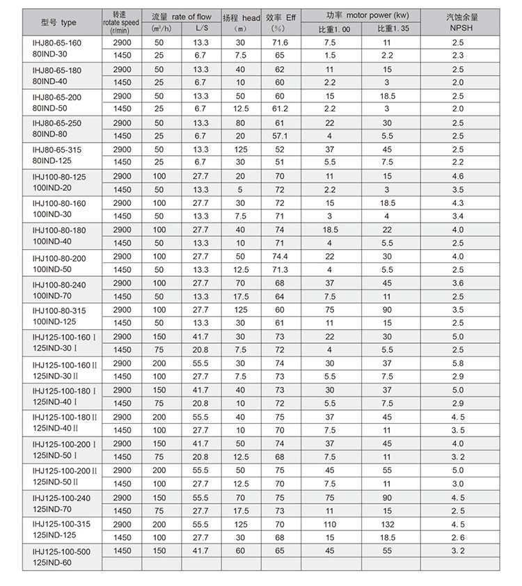 Ihj (ind) series single-stage single suction bracket type chemical centrifugal pump, is my company introduction, digestion and absorption advanced technology to optimize the design, selection of outstanding domestic hydraulic model and according to the pump energy saving performance, technical requirements and experimental methods of design and development and, marking its rated performance and size effect with international standard ISO2858 - 1975 (E) is a to replace F type corrosion resistant pump replacement products and promotion of our country energy-saving pump one. The product has the advantages of reasonable structure, stable and reliable performance, beautiful appearance, convenient maintenance and maintenance. Products won the national patent, patent number: ZL200720038809.9. This product is widely used in the transport of water and physical properties of the -20 at ~105, which is similar to the water and physical properties of the solid particles. The products are widely used in petroleum, chemical industry, chemical fiber, food, beverage, brewage, starch and sugar industry, metallurgy, medicine, paper and other industrial engineering.